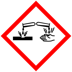 Ætsende | GHS05 symbolet viser en hånd og et metal, der bliver ætset, og advarer om, at produktet er ætsende. Dette betyder, at stoffet kan forårsage alvorlige hudforbrændinger og øjenskader samt være ætsende for metaller. |
