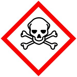 Akut giftig | GHS06 symbolet viser et dødningehoved med korslagte knogler og advarer om, at produktet er meget giftigt. Dette betyder, at stoffet kan forårsage alvorlige sundhedsskader eller død ved indtagelse, hudkontakt eller indånding. |