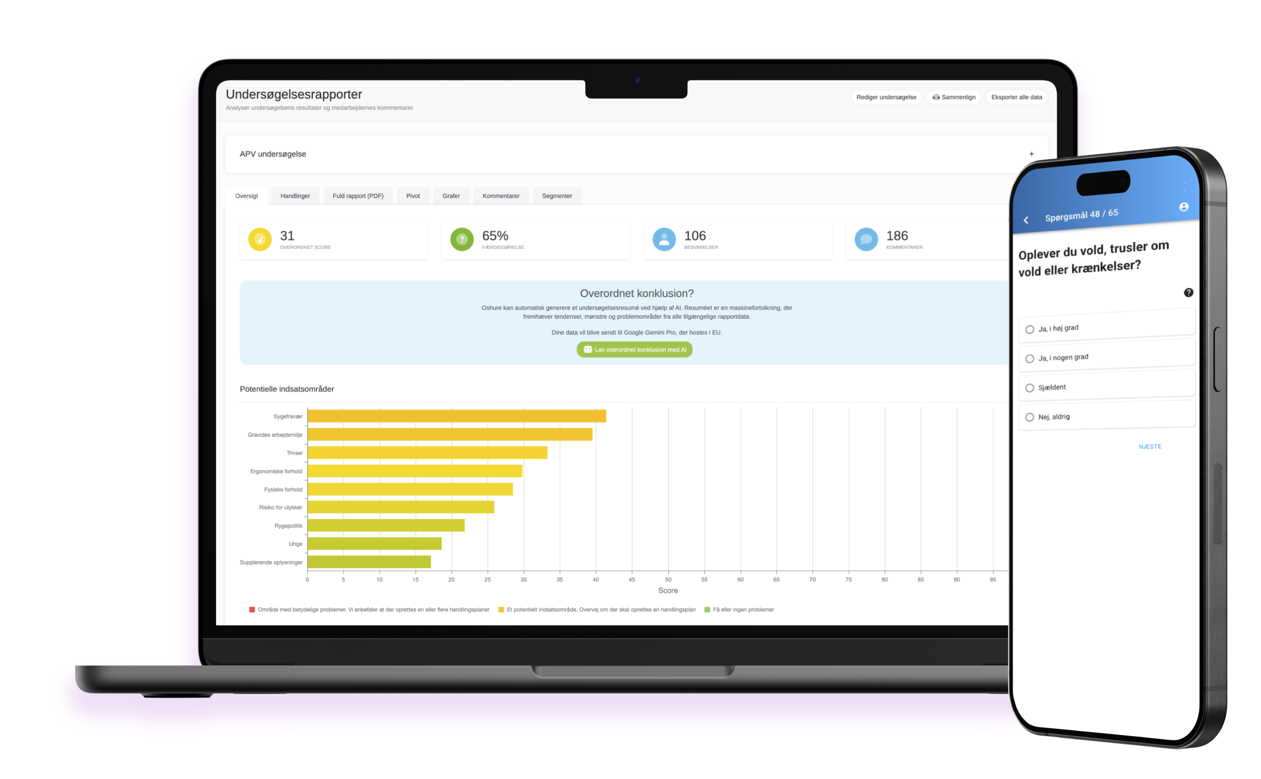 Ja, med Oshure’s online-værktøj kan man både automatisk eller interaktivt generere forskellige PDF eller Excel-rapporter og analyser baseret på undersøgelsesresultaterne. Dette gør det nemt at identificere trends, mønstre og områder, der kræver særlig opmærksomhed. Det er også muligt at give fx mellemledere adgang til at lave deres egne rapporter baseret på det udsnit af data du giver dem adgang til.